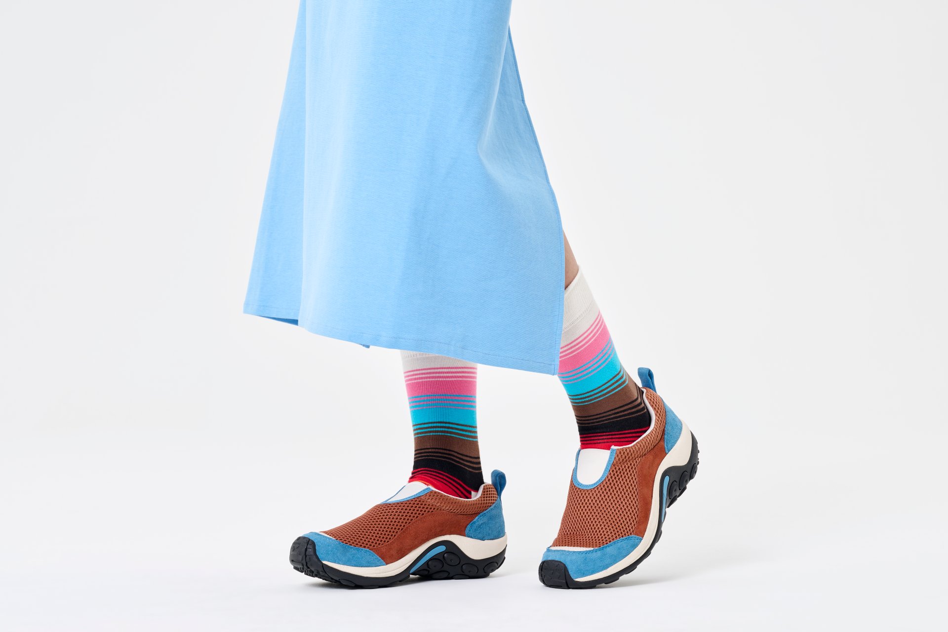 Els mitjons Pride Stripe s'inspiren en la bandera del Pride "Progress" dissenyada per Daniel Quasar que inclou tot l'arc de Sant -martí de la comunitat LGBTQ. El rosa, el blau cel i el blanc representen a les persones transgènere i no binaries, mentre que el negre i el marró representen a les comunitats de color marginades així com als afectats per la SIDA.